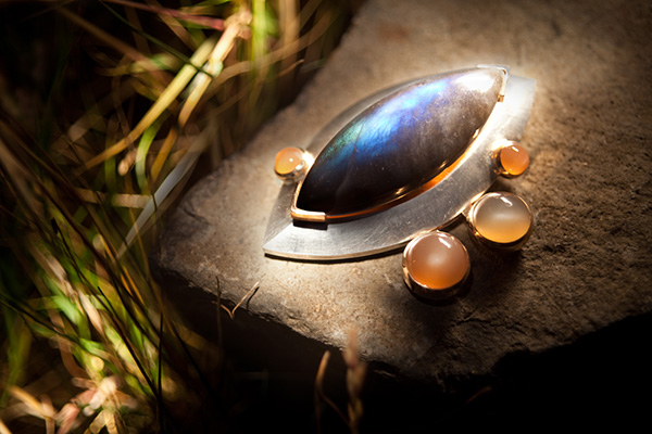 Brosche 'Farbenspiele' aus Silber, Labradorith und Mondsteine in Roségold eingefasst