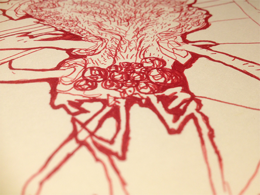 Freie Arbeit, Ausschnitt einer Illustration aus roter Tinte, Zeichnung einer Phantasiespinne