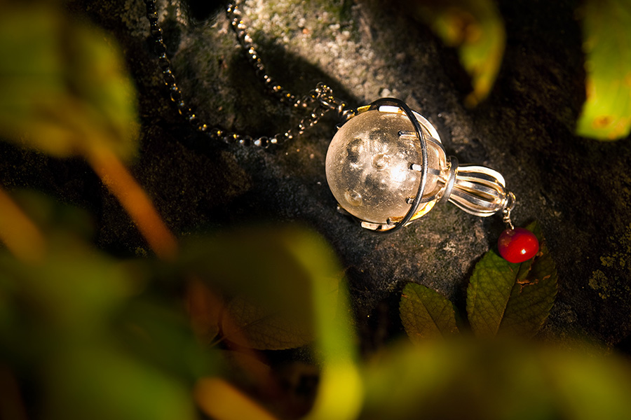 Anhänger, in Silber eingefasstes Fundstück (transparente Kunststoffkugel) mit rotem Pflanzensamen