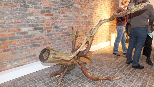 Baumstumpf mit selbstgewebtem Spinnennetz aus Nylon zur Mauer im Ausstellungsraum