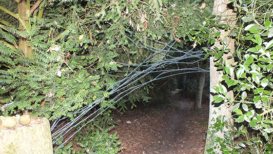 Netzartiger Bogen gespannt über Waldweg aus grüner Wolle